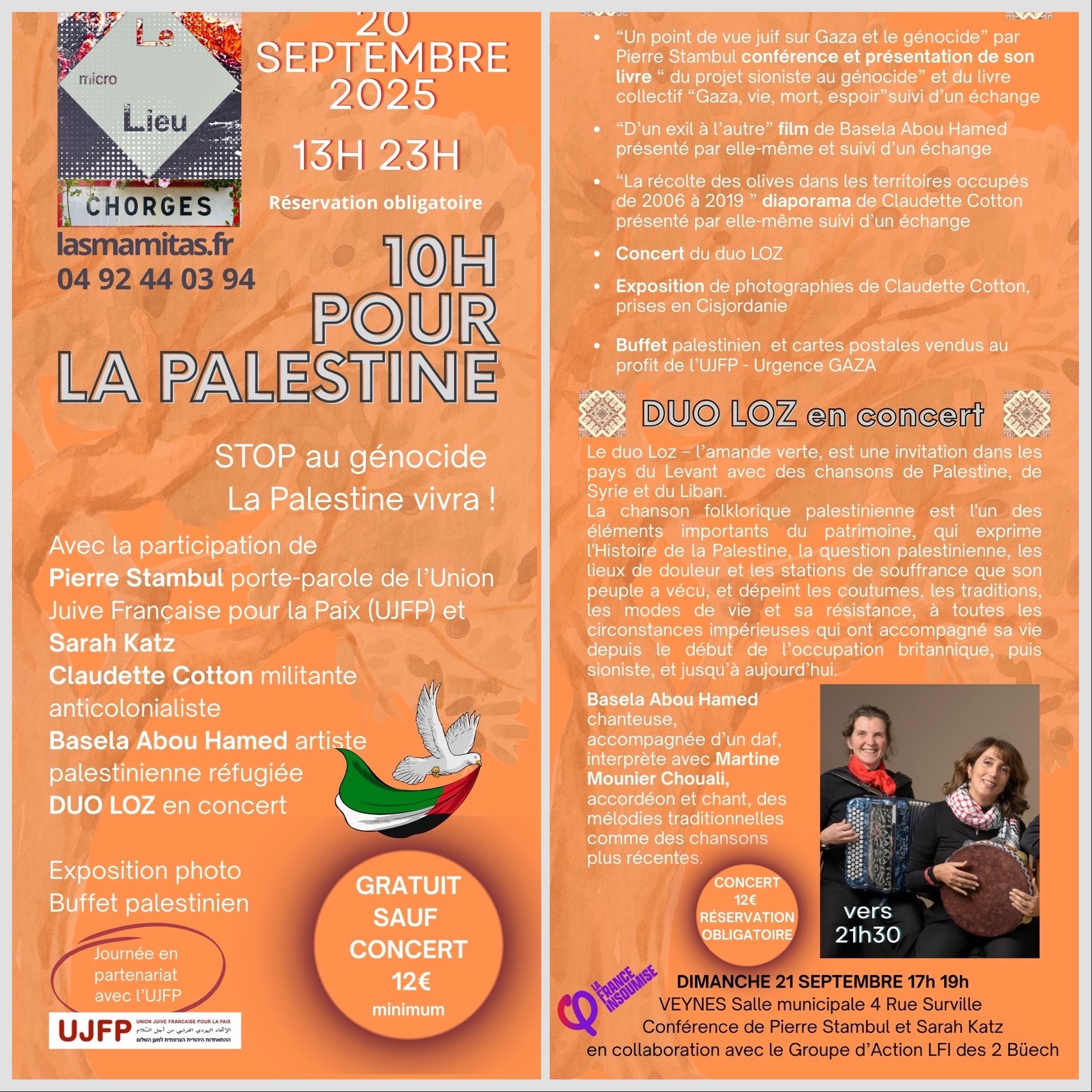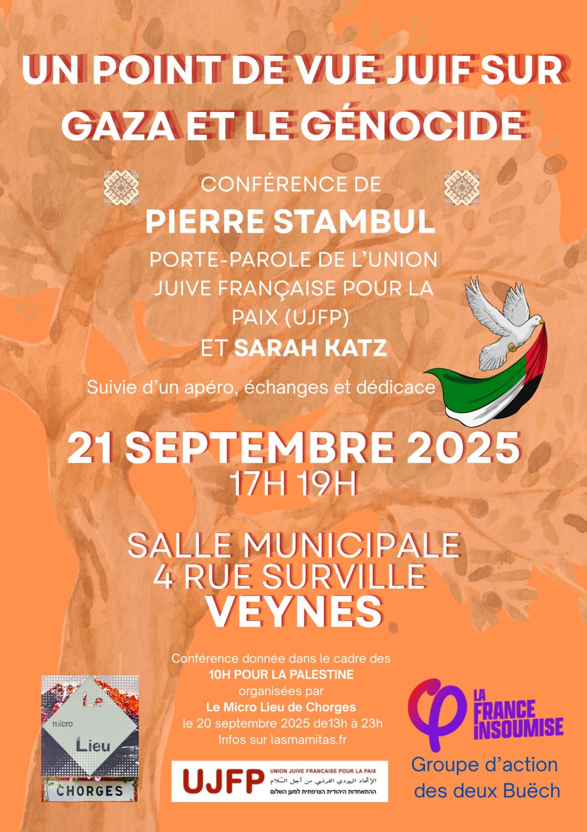 En complément des 10 heures pour La Palestine à Chorges, Pierre Stambul et Sarah Katz donneront la même conférence à Veyes le lendemain.